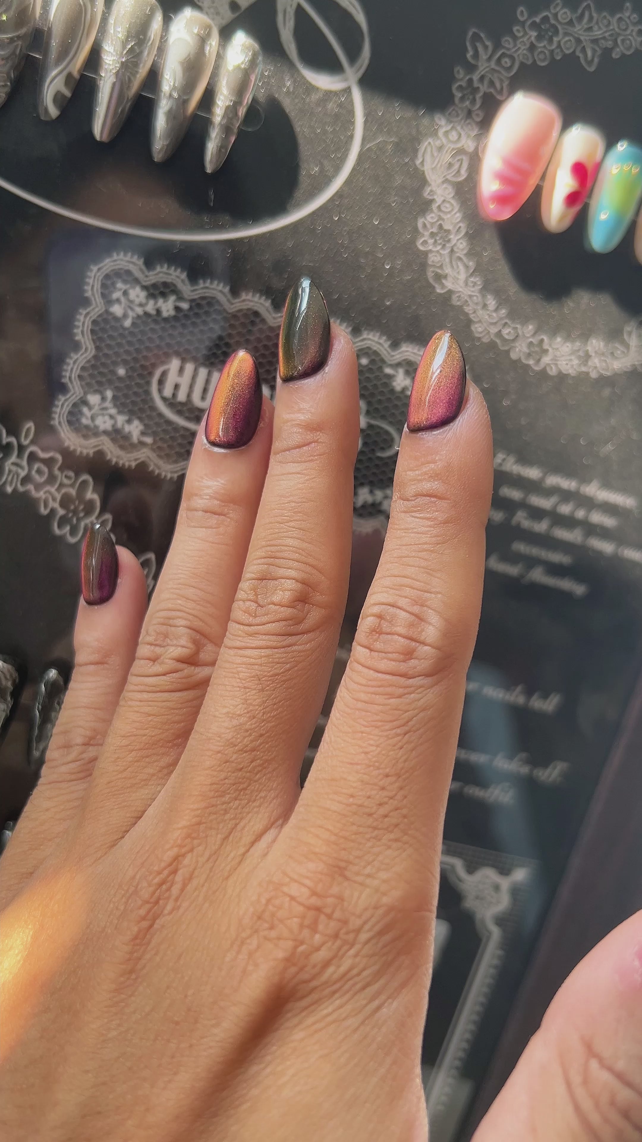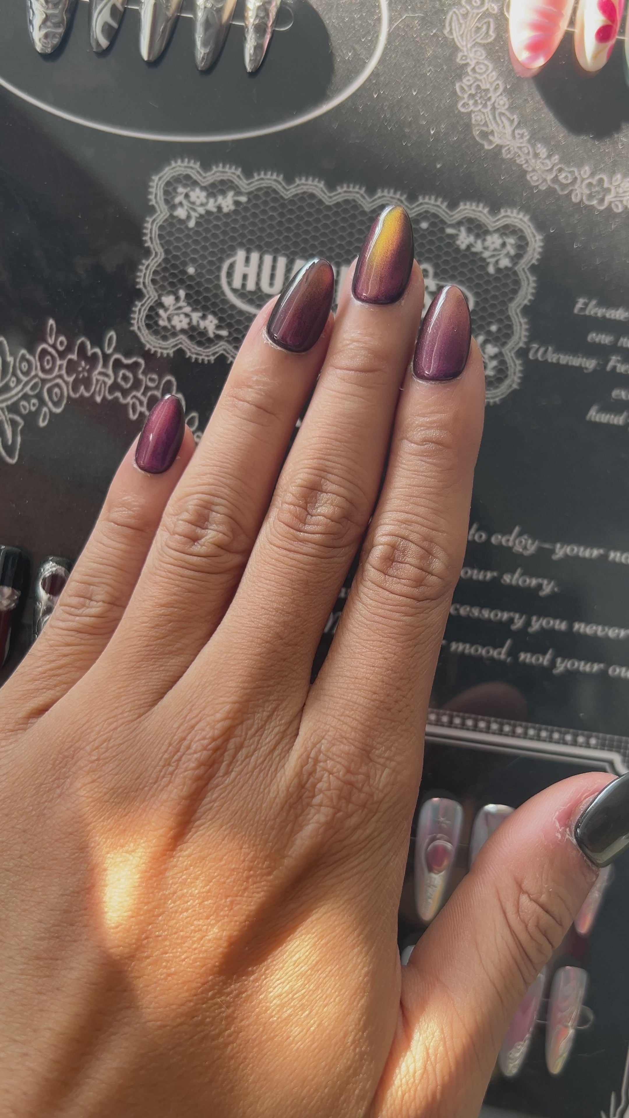 Deep burgundy pigments meet a luminous magnetic flare that creates a deep glowing arc across each nail. Every set is meticulously hand painted in our studio to provide a custom salon look that stands out from mass produced alternatives. These nails are crafted with multiple layers of professional grade gel for a glass like shine and maximum durability that keeps your manicure looking perfect for weeks.