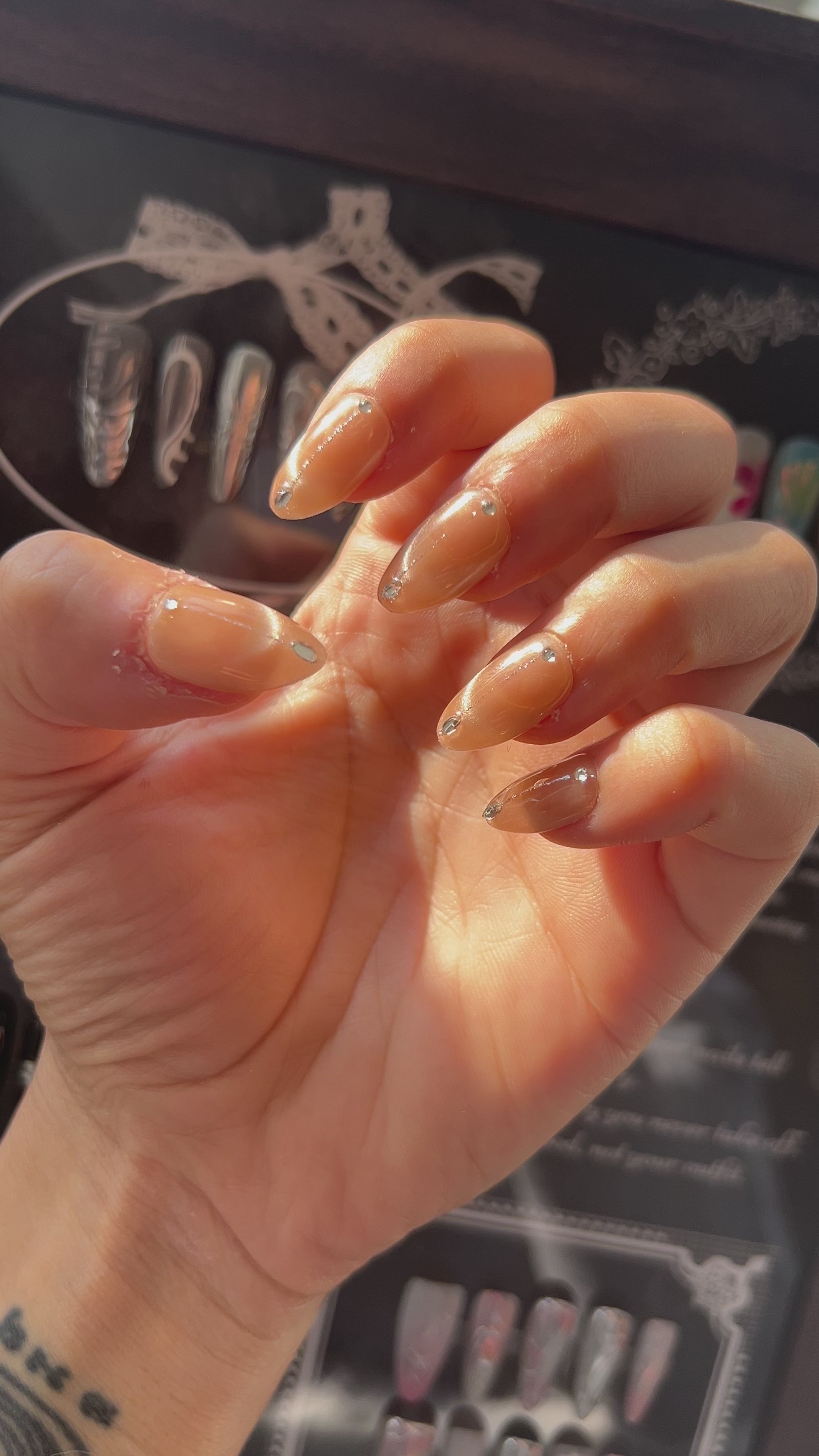 Warm sand pigments meet a sharp vertical magnetic flare that creates a glowing silk like shimmer across the center of each nail. Every set is hand painted in our studio and detailed with tiny crystal accents to provide a custom salon look that stands out from mass produced alternatives. These nails are crafted with multiple layers of professional grade gel for a glass like shine and maximum durability that keeps your manicure looking perfect for weeks.